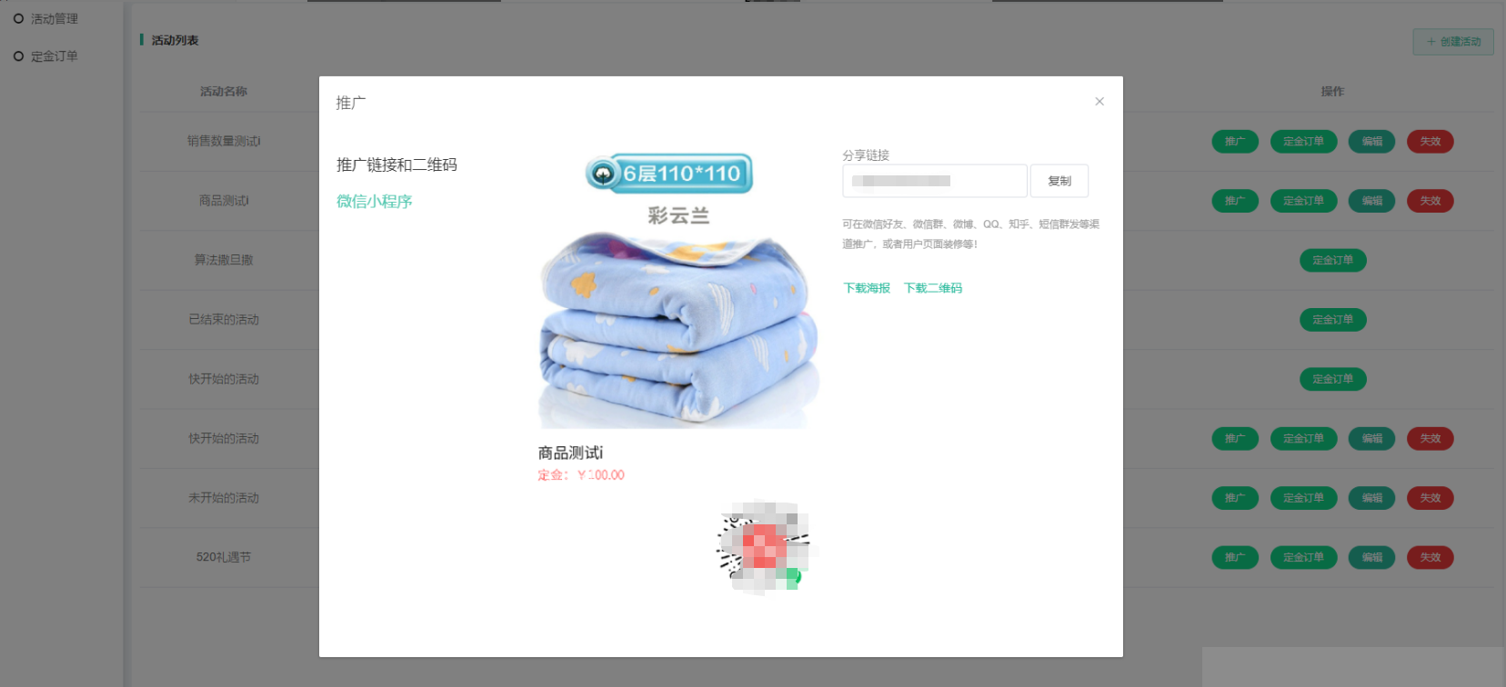 (2)点击推广,可生成活动对应海报及活动详情相应的链接;