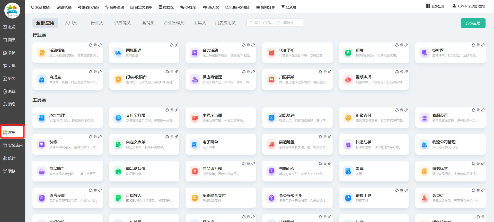 目录 搜索 展开 一、前期准备资料二、数字乡村码-上线操作指南1、服务号的申请流程及认证2、申请小程序流程3、开放平台绑定小程序和公众号三、数字乡村码-系统操作数字乡村码系统管理-概况数字乡村码-商品管理1、发布商品2、商品列表3、商品表单4、商品分类5、品牌管理6、配送模板7、评论管理8、优惠券管理9、商品标签10、退货地址设置11、满额优惠12、批量操作13、配送方式14、基础设置15、商品隐藏四、数字乡村码-会员管理1、全部会员2、会员等级3、会员分组4、资格申请5、会员设置6、推广中心设置7、会员邀请码8、会员关系链修改关系链修改记录9、会员合并记录10、账号注销管理11、会员设置中心五、数字乡村码-订单管理1、订单管理列表2、订单处理流程3、订单状态4、订单修改价格5、订单退款退货6、多包裹发货7、批量发货订单操作步骤8、催发货订单9、物流查询六、数字乡村码-财务管理1、余额设置2、会员余额3、充值记录4、转让记录5、余额明细6、收入明细7、提现设置8、提现统计9、积分管理10、转账审核11、收益广告12、批量充值七、数字乡村码-系统管理1、商城入口2、商城设置①、商城设置②、订单设置③、物流查询④、短信⑤、联系方式⑥、分类⑦、优惠券⑧、分享⑨、幻灯片⑩、广告位⑫、地图设置3、交易设置4、微信模板消息自定义消息模板(新版)自定义消息模板(旧版)小程序消息模板公众号模板消息变更公告5、语言设置6、权限管理7、多媒体管理八、数字乡村码-消息管理九、数字乡村码-应用管理十、数字乡村码系统-数据统计十一、数字乡村码-页面装修DIY1、模板管理2、店铺页面3、顶部导航4、底部导航5、DIY模板市场6、首屏广告7、基础设置8、装修DIY尺寸建议十二、供应商功能插件操作指南1、供应商2、门店-收银台门店申请和使用步骤门店管理①、门店-收银台 营销设置②、门店-收银台 分润设置门店分类门店申请门店审核门店商品门店商品订单收银台订单数据统计核销员基础设置默认设置门店装修3、微社区4、会务活动十三、营销插件操作指南活动报名提货卡新人奖微店问卷调查积分视频分享1、视频分享基础设置2、视频分享发现管理3、视频分享分类管理4、视频分享评论管理5、视频分享分红记录6、视频分享短视频中心每日红包幸运大抽奖签到优惠券二维码任务奖励优惠劵文章音频文章付费文章限时购新海报拓客卡操作流程积分活动素材中心视频红包十四、入驻门店应用类1、门店预约2、附近商品3、门店定位设置4、门店控制5、门店满额包邮6、门店满额减7、导入商品8、门店搜索9、门店股东10、核销券11、多门店核销1、商城后台设置2、前端功能演示十五、常见问题1、后台登录密码修改流程2、会员-余额,积分,后台如何进行充值与扣除3、如何修改上下级关系4、一种万能的获取商城小程序路径的方法 暂无相关搜索结果! 阅读次数:1629 本文档使用 模王系统 发布 九、数字乡村码-应用管理 九、商城管理-应用显示所有商城已安装并启用的应用,包含以下大类:具体根据自家商城后台系统显示为准。每个应用功能设置步骤较多,请查看相对应应用的学习文档。文档更新时间: 2024-01-08 10:36 作者:链上旅行