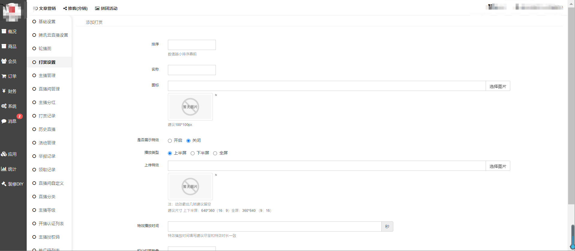 备注:打赏主播,可以在平台后台打赏设置先设置好打赏内容,比如特效、打赏金额等设置。
